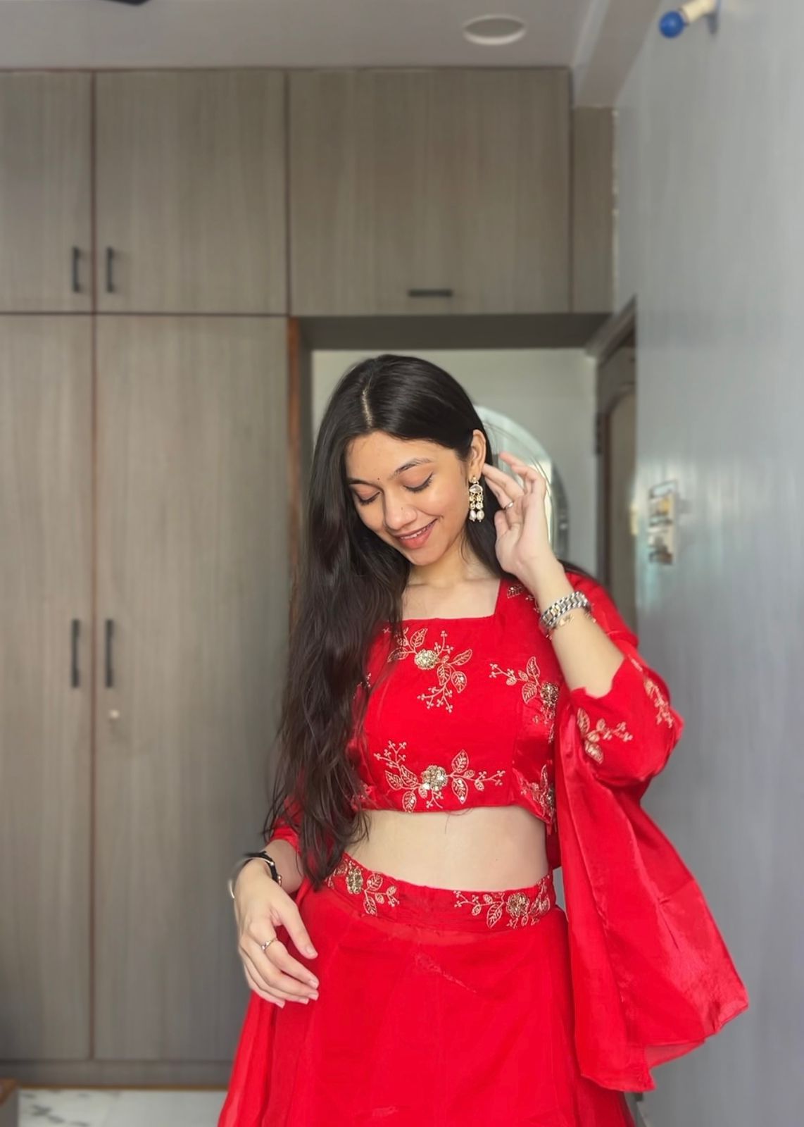 Heavy quality Frendy fabric 3-in-1 lehenga set featuring padded full-sleeve blouse, full-flair lehenga and matching dupatta belt with crepe lining.