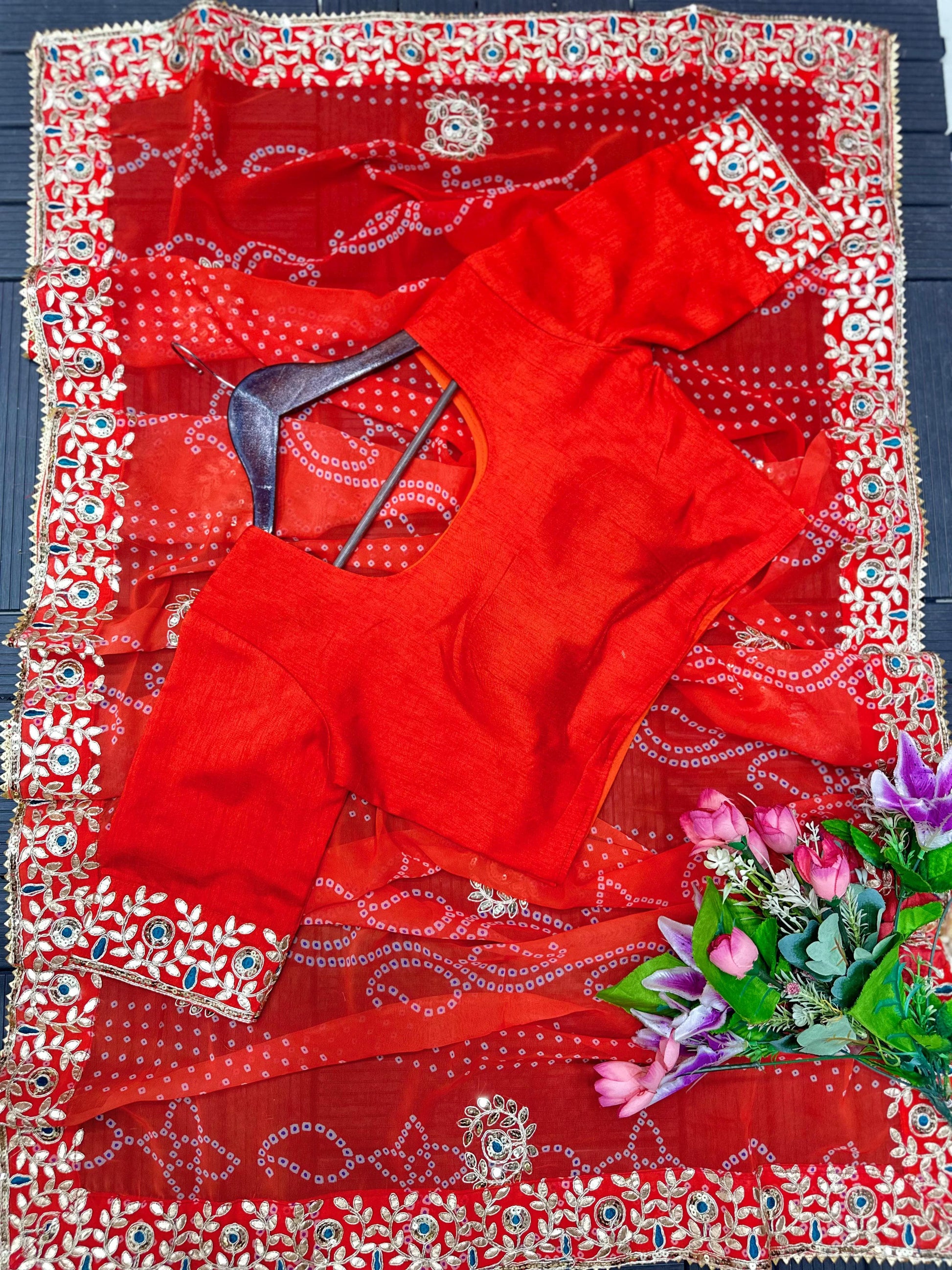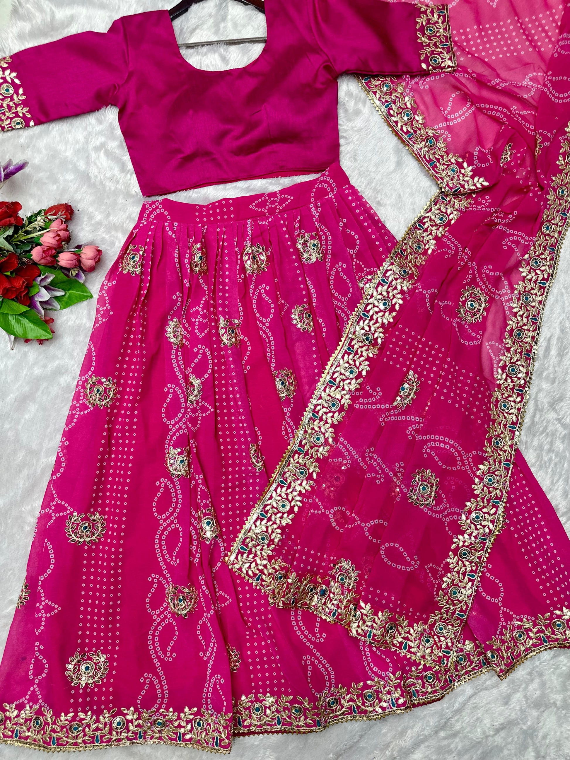 Upgrade your festive wardrobe with this super hit Bandhani print lehenga choli set, beautifully detailed with embroidery & gotta patti work.