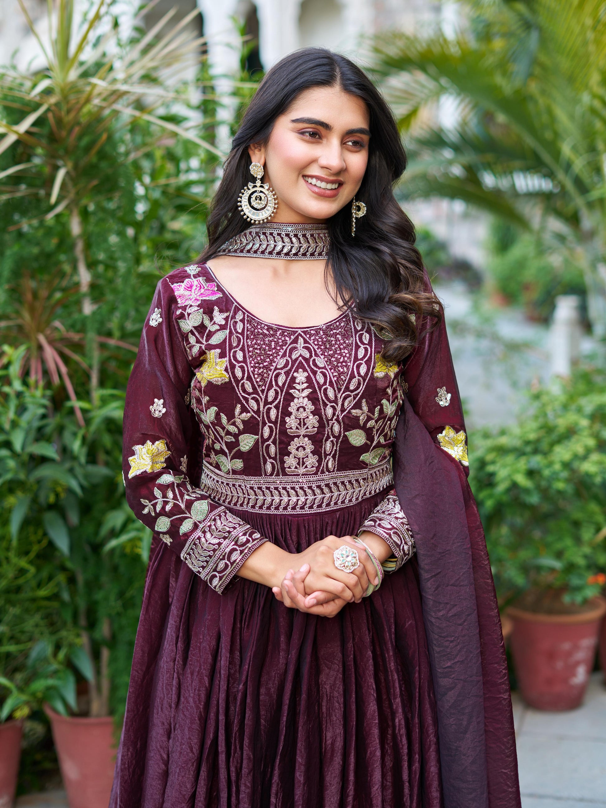 The gown is enhanced with heavy cording sequence and thread embroidery work, giving it a rich festive and party-ready appeal.