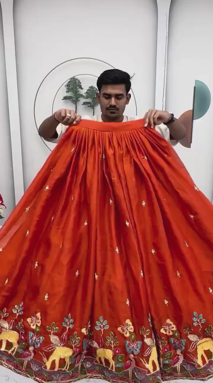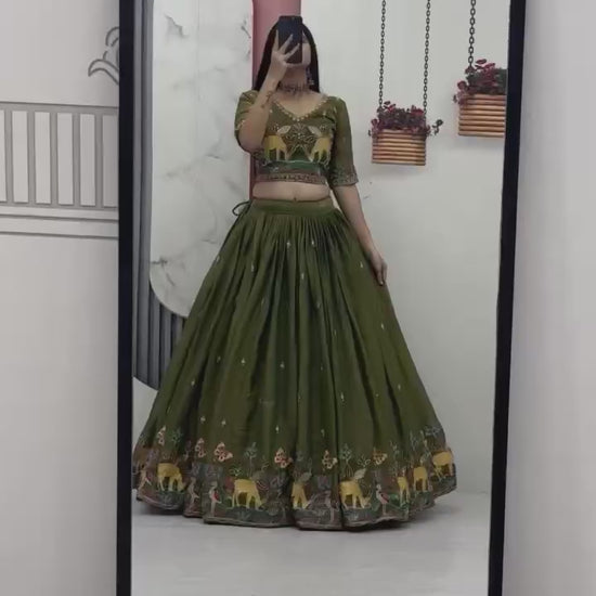 Bring festive vibes to your wardrobe with this Premium Festival Lehenga Choli Set, crafted in rich Moss Simar fabric with heavy embroidery thread & piping work.