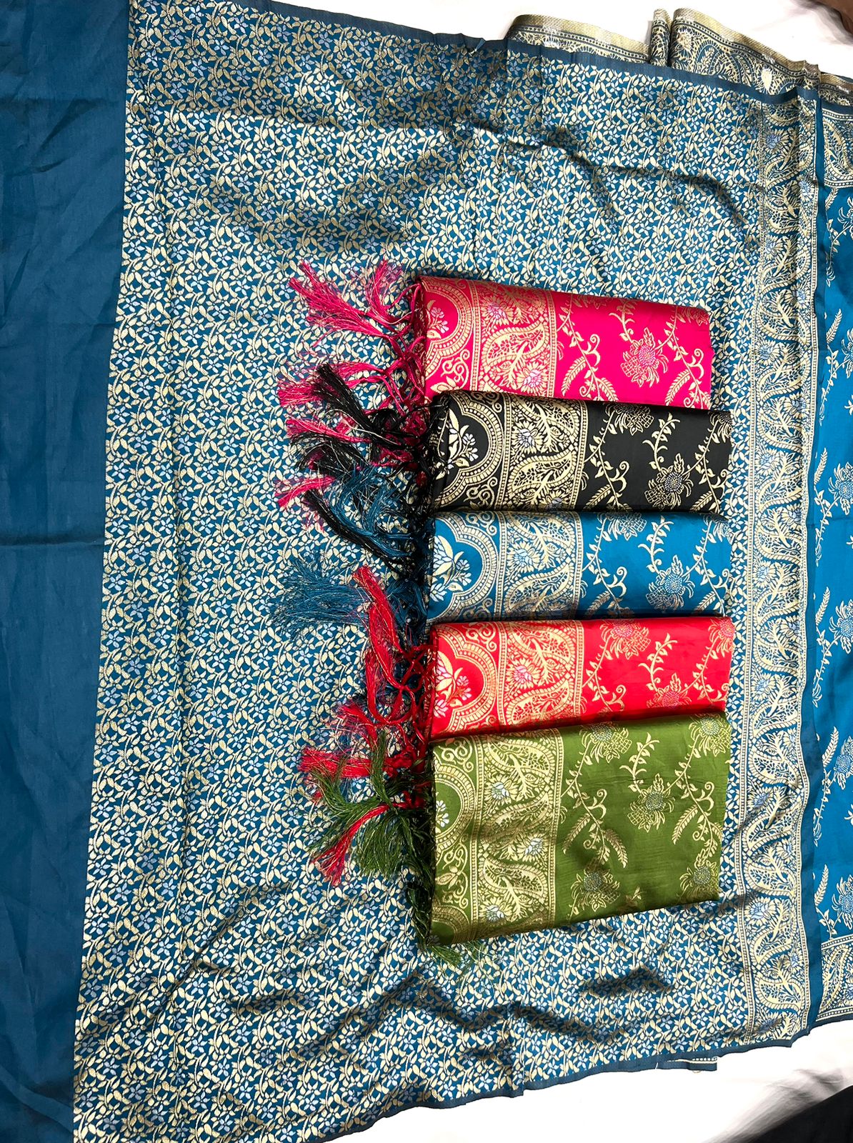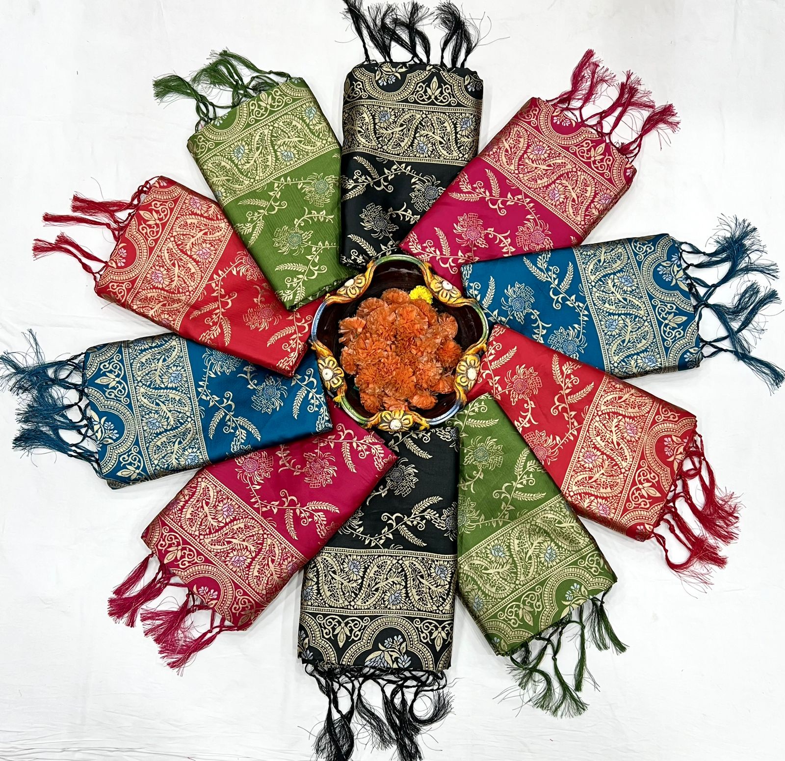 Elegant olive green colour ke saath rich golden floral woven work is saree ko premium festive look deta hai. Soft drape aur classy finish ke saath wedding, festival aur party wear ke liye perfect choice. Traditional aur modern dono style ka balance.