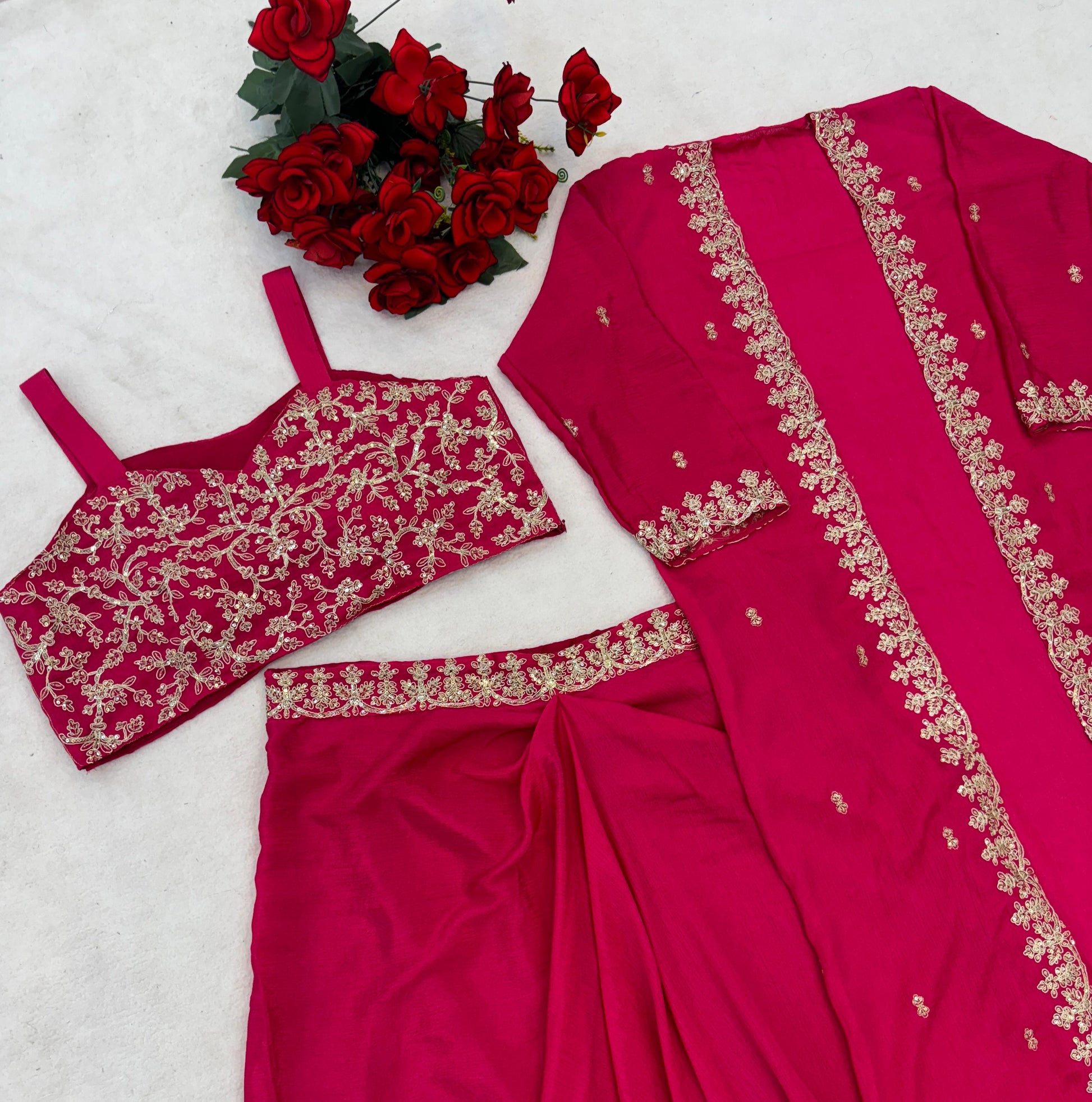 Premium Chinon silk fabric ke saath elegant embroidery aur sequence work.