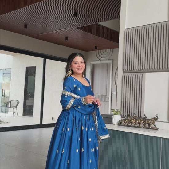 Premium Designer Embroidered Chinnon Gown with Dupatta – Royal Blue & Wine
