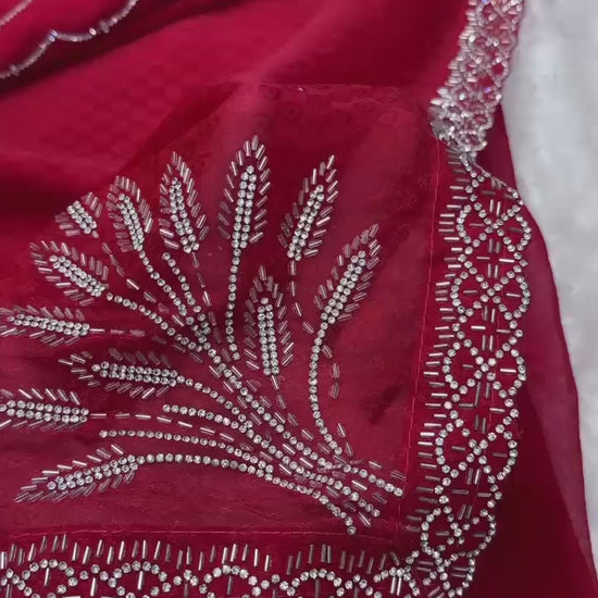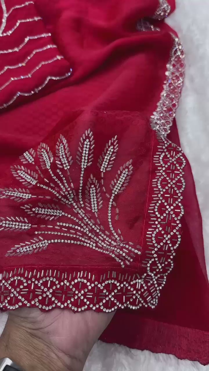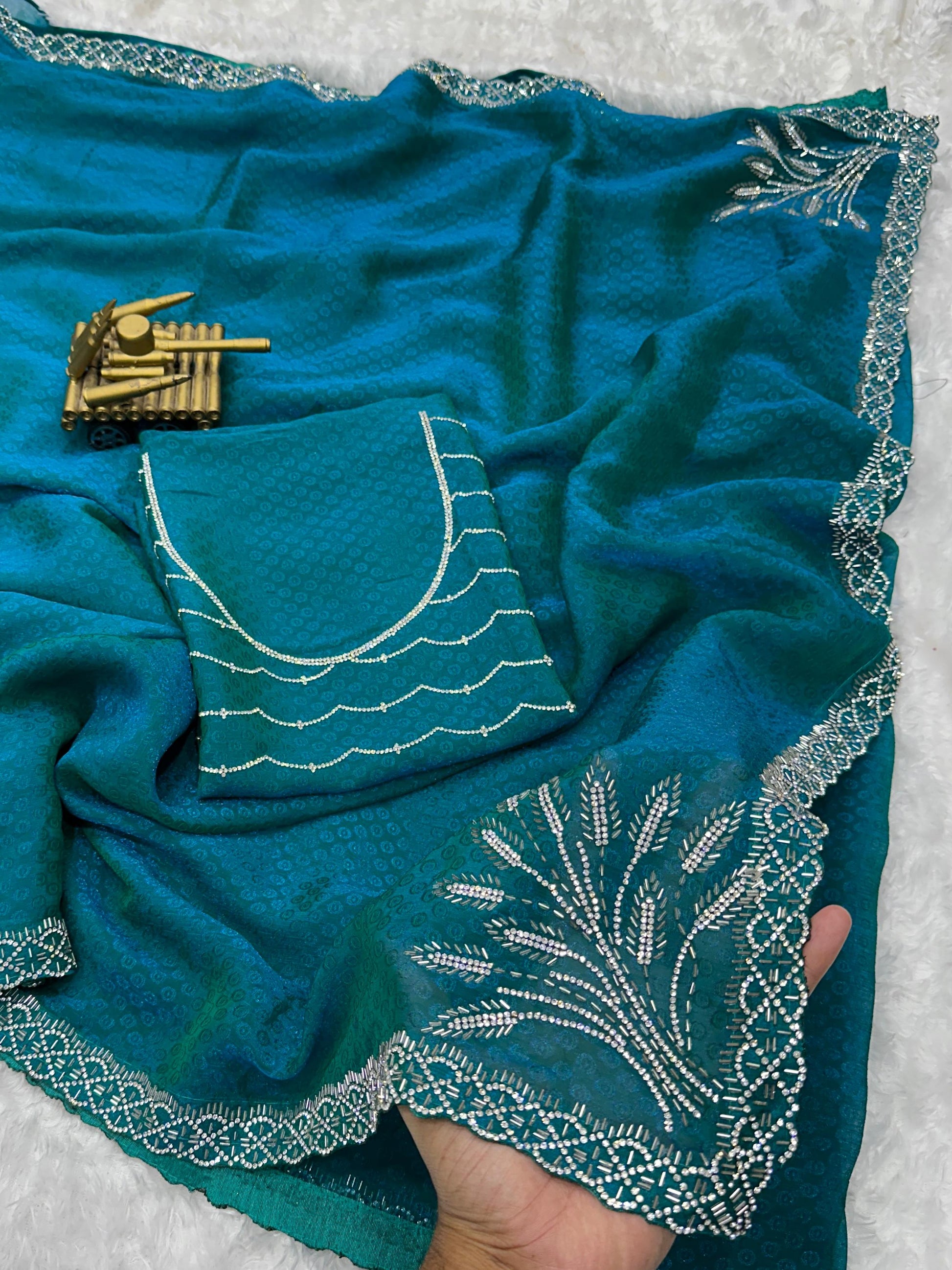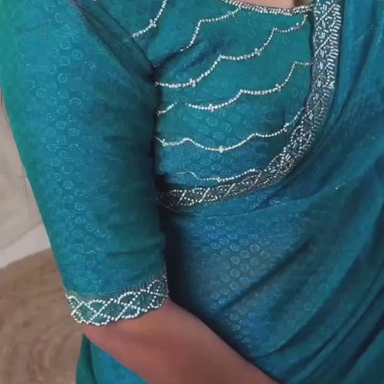 Upgrade your party look with this stunning Pure Two Tone Fandy Satin Saree, beautifully designed with premium Swarovski and beads work on the border and elegant pallu detailing. The rich self-jacquard pattern adds a luxurious touch, making it perfect for weddings, parties, and festive occasions.