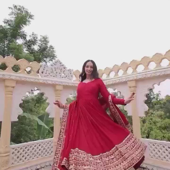 Elegant red Anarkali gown crafted in premium Fox Georgette fabric with heavy embroidery sequence work. Comes with matching embroidered dupatta. Fully stitched and ready to wear—perfect for weddings, parties, and festive occasions.