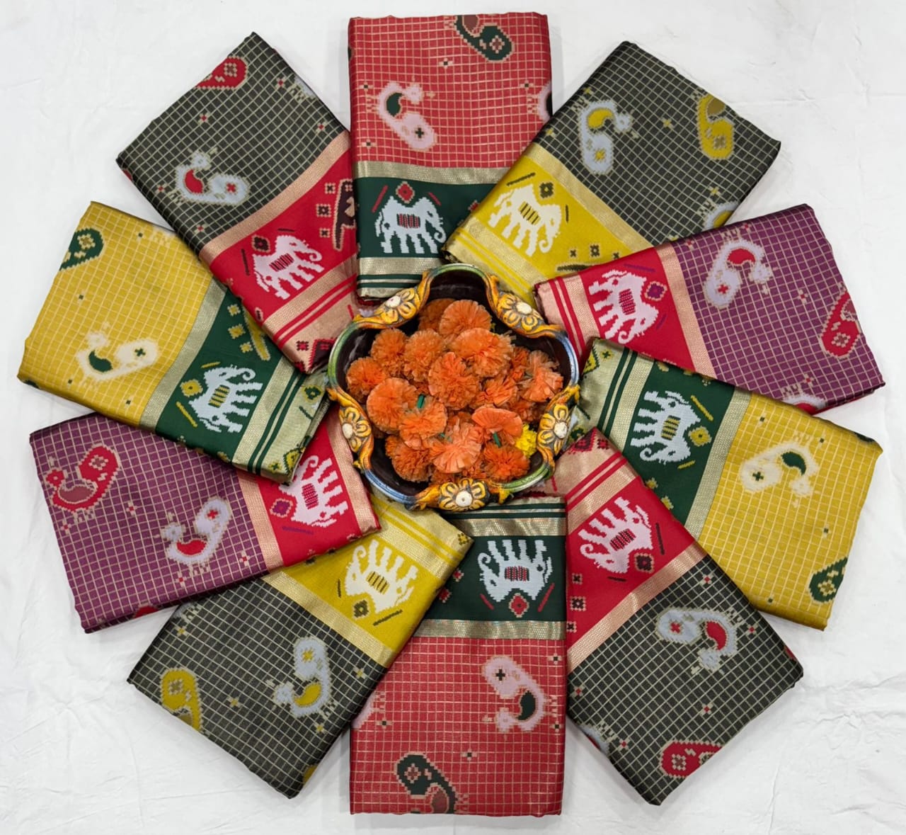 Soft Lichi printed saree with traditional elephant and bird design. Lightweight, comfortable and suitable for daily & festive wear. Blouse piece included.
