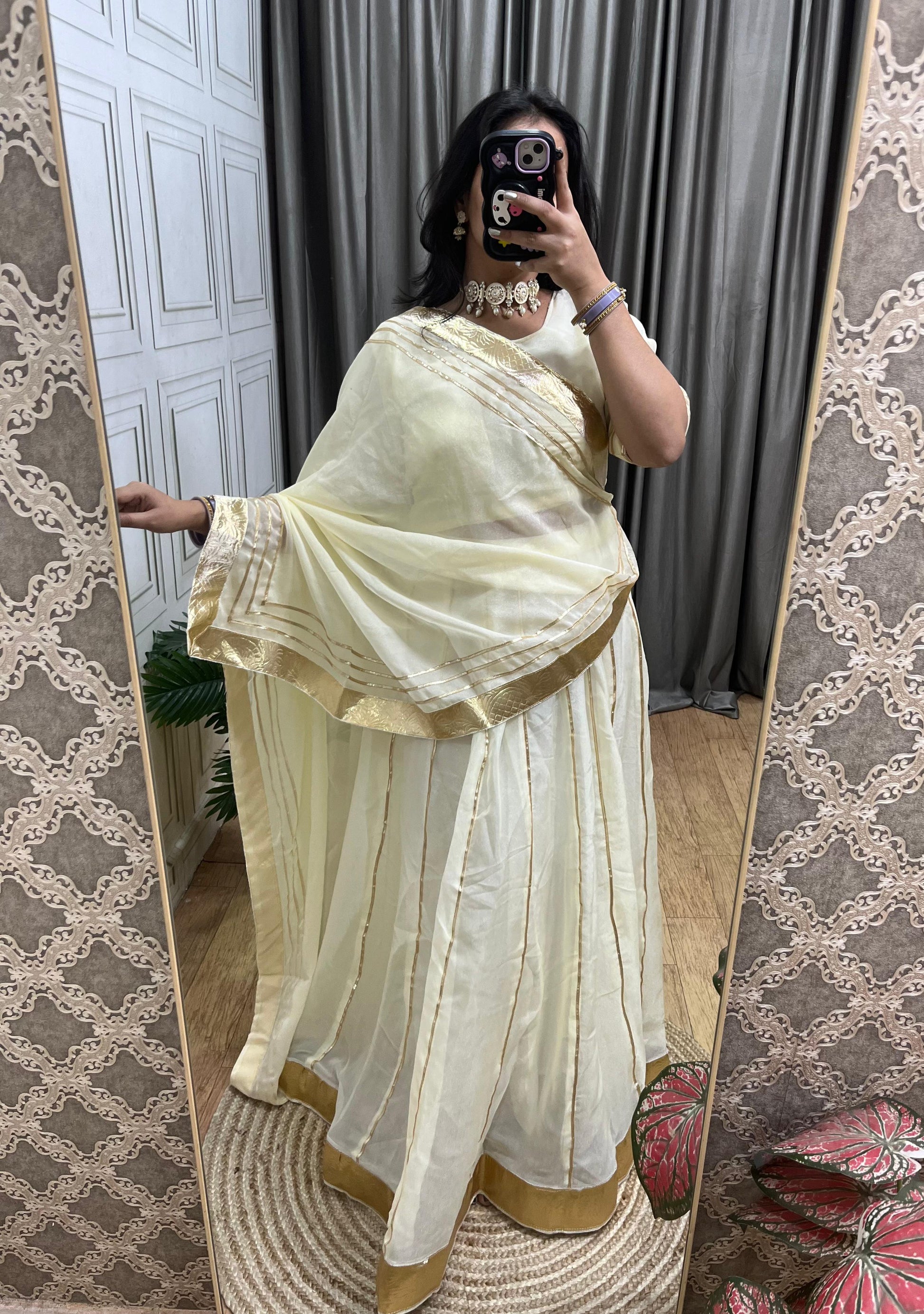 Lehenga par Kaachi Gota Work aur Gold Embossed Lace Border diya gaya hai jo poore outfit ko royal touch deta hai.