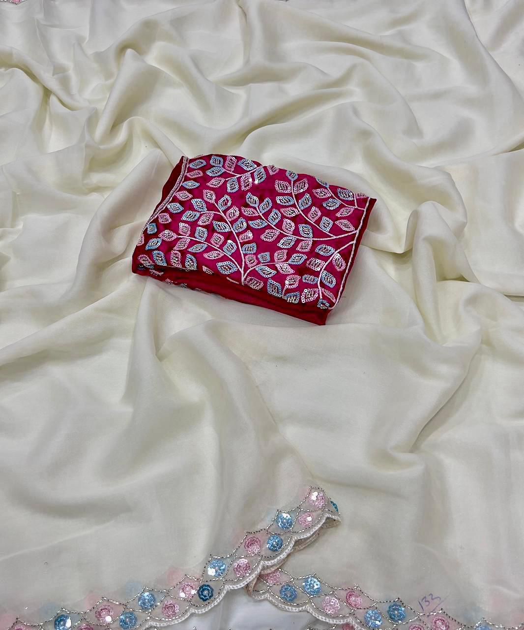 White Star Satin Georgette Handwork Saree